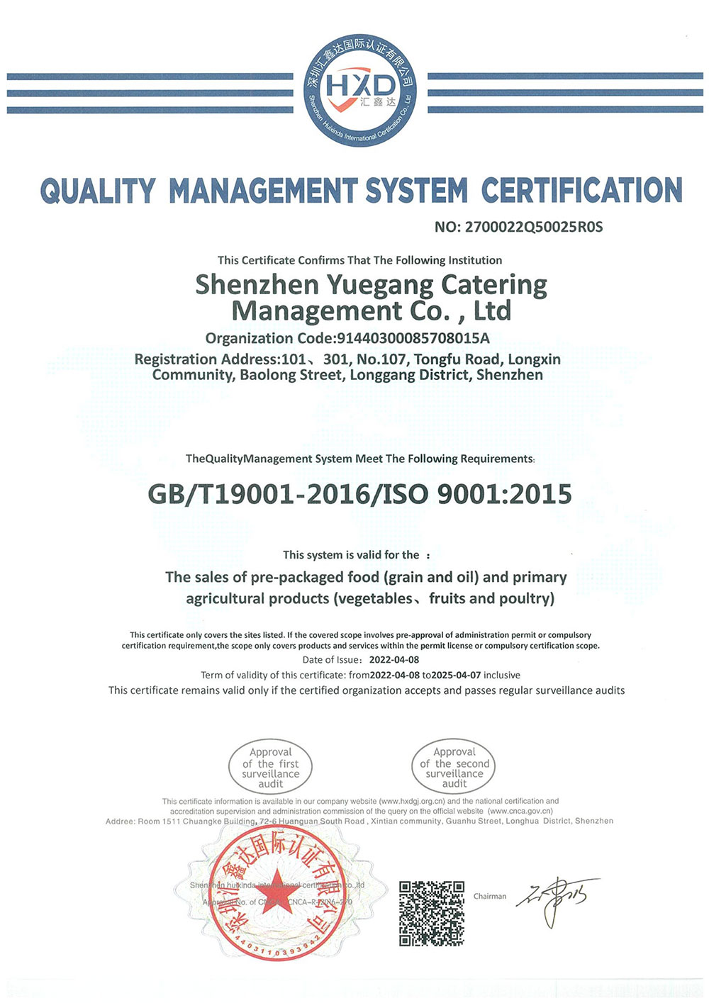 深圳市粵崗餐飲管理有限公司,是一家集蔬菜種植和農(nóng)副產(chǎn)品配送為一體的專業(yè)型餐飲公司,主要為學校、工廠企事業(yè)機關單位提供蔬菜和農(nóng)副產(chǎn)品配送服務。公司自成立以來始終以質(zhì)優(yōu)價廉、服務至上為原則,嚴格按照ISO:9001國際標準體系進行管理。同時建立了行業(yè)領先的配送中心、大型冷庫和保鮮庫、檢測中心以及專業(yè)化的配送團隊,能長期安全、穩(wěn)定、準時的配送貨物。我們所有蔬菜均經(jīng)過初步加工、無黃葉,無泥沙等雜質(zhì),利用率達97%以上...保障向用戶提供的各類食材的衛(wèi)生和質(zhì)量。公司為了適應不同客戶的需求,配有專業(yè)人員和配送車輛,實行“一對一”的服務體制,一心一意的為客戶服務,秉承粵崗誠實守信、服務第一、客戶至上的服務標準,真正讓客戶花最少的錢吃最好的菜。粵崗多年來何以欣欣向榮,因為我們知道只有勇于擔當責任,才能承擔更大的責任,就是因為 粵崗員工貫徹公司態(tài)度決定一切、細節(jié)決定成敗的真理,從質(zhì)量抓起,從服務做起,才創(chuàng)造了如今的規(guī)模化供應、統(tǒng)一性配送、專業(yè)化服務的粵崗。
